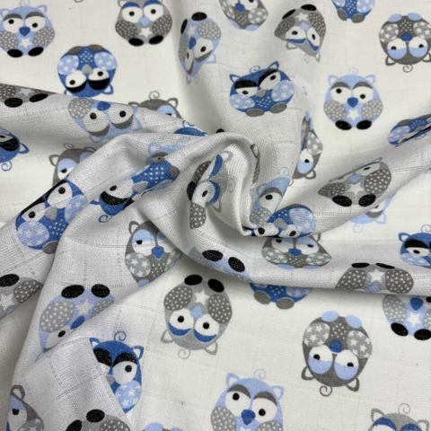 100% pamut, nyomott mintás tetra pelenkaanyag. Legkisebb rendelési mennyiség 1 méter. Nyomott mintás tetra pelenkaanyag. Puha, jó nedvszívó. Kék, szürke mintás baglyok fehér alapon. Összetétel: 100% pamut. Felhasználás: pelenka, kifogó, nyálkendő, törl