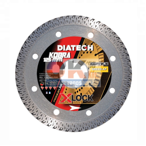 Diatech Kobra gyémánt vágótárcsa 125 mm Szinterezett, folyamatos élű vágótárcsa, kiváló vágás minőséggel. A tárcsa speciális Xlock felfogatással rendelkezik, de hagyományos sarokcsiszolóra is felszerelhető. A speciális szegmens kialakítás hosszú élettart