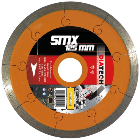 Diatech SMX gyémánt vágótárcsa 125 mm Alkalmas csempe, kerámia, gres, kőporcelán, márvány, mészkő lapok vágásához. A folyamatos vágóél tiszta vágási élt biztosít, esztétikus, igényes vágásokhoz kitűnő választás. Száraz vágáshoz, sarokcsiszolóval használha
