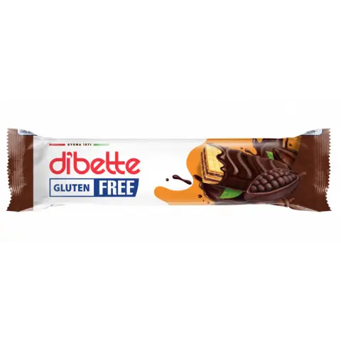 Dibette kakaós ét mártott, kakaós krémmel töltött ostya fruktózzal gluténmentes 26 g Összetevők: kakaós krém 39% (részben hidrogénezett növényi zsír (pálma), burgonya keményítő, zsírszegény kakaópor (9,5%), fruktóz (9%), sovány tejpor, édes tejsavópor