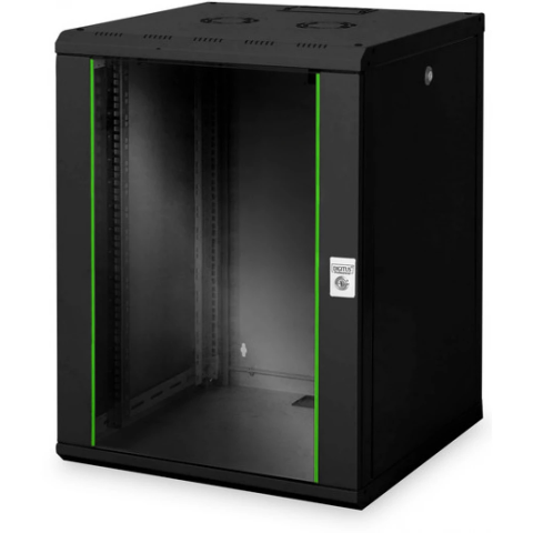 16U fali szekrény, Egyedi 820x600x600 mm, fekete szín (RAL 9005). - IP20 biztonsági osztály - Zárható biztonsági üvegajtó acél kerettel - 210°-os ajtónyitási szög - 1 pontos zárszerkezet a bejárat...