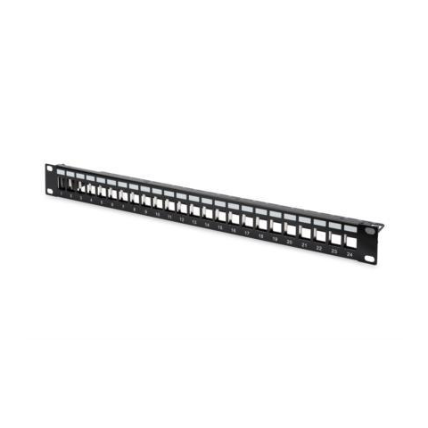 - 1U, 19" - 24 portos moduláris (üres) patch panel - Digitus Keystone modulokkal / toldókkal használható - Fekete szín - Szélesség: 483 mm - Mélység: 1.5 mm