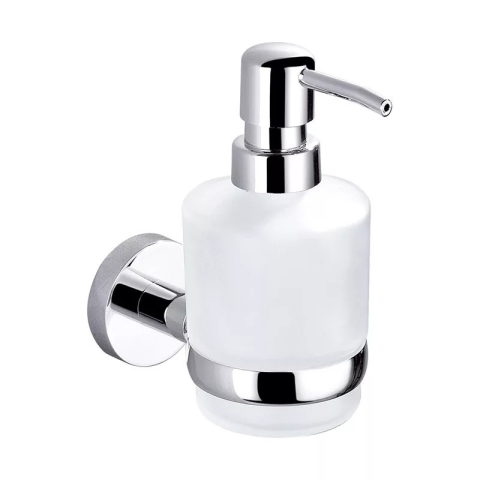 Króm színű pumpás folyékonyszappan adagoló sárgaréz anyagból és edzett üveből. Falra szerelhető.