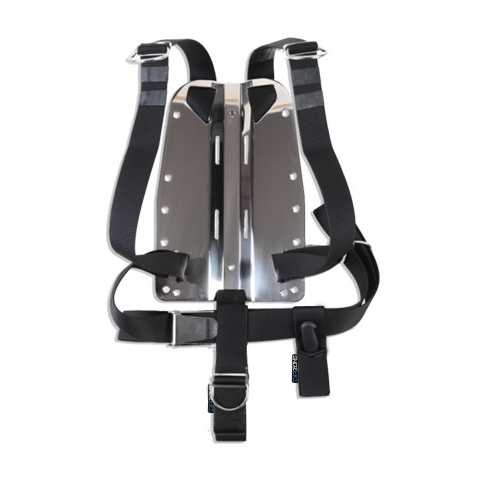 Rozsdamentes acél hátlap, vastagság 3 mm vagy 6mm PA hevederrel, rozsdamentes acél D-gyűrűk és stopperek, rozsdamentes acél csat, ágyékheveder és zseb késsel. Rozsdamentes acél háttámla 3 vagy 6mm mm vastagságú PA hevederrel Rozsdamentes acél D-gyűrű