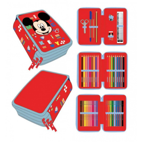 Disney Mickey tolltartó töltött 3 emeletes. Tartalma: - 18 db színes ceruza - 18 db színes filctoll - 1 db grafit ceruza - 1 db hegyező - 1 db radír - 1 db kék toll - 1 db piros toll - 1 db vonalzó - 1 db órarend - 1 db olló Méret: 12,5*19,5*6,5 cm Kiv