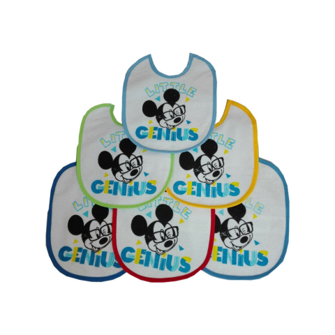 Disney Mickey 6 darabos baba pamut előke szett gumírozott nyakpánttal, különböző színekben. Anyagösszetétel: 65% pamut, 35% poliészter
