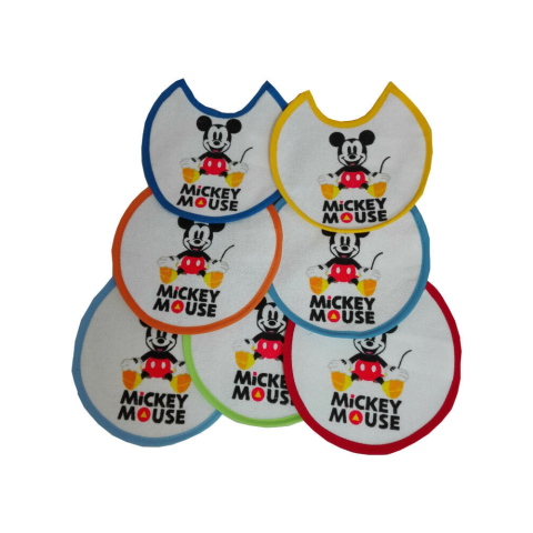 Disney Mickey 7 darabos baba pamut előke szett gumírozott nyakpánttal, különböző színekben a hét minden napjára. Anyagösszetétel: 65% pamut, 35% poliészter