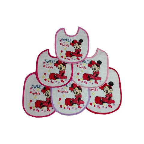Disney Minnie 6 darabos baba pamut előke szett gumírozott nyakpánttal, különböző színekben. Anyagösszetétel: 65% pamut, 35% poliészter