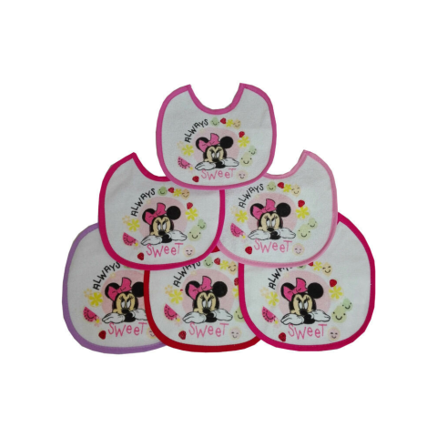 Disney Minnie 6 darabos baba pamut előke szett gumírozott nyakpánttal, különböző színekben. Anyagösszetétel: 65% pamut, 35% poliészter