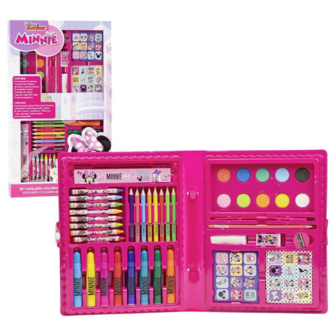 RAKTÁRRÓL AZONNAL! Disney Minnie Smiles írószer szett Mérete: 27x45 cm Tartalma: - 8 db filctoll - 8 db zsírkréta - 1 db faragó - 8 db színes ceruza - 1 db radír - 10 db színes vízfesték - 1 db ecset - 1 db HB ceruza - 1 db vonalzó - 1 db szivacs - 2 ív m