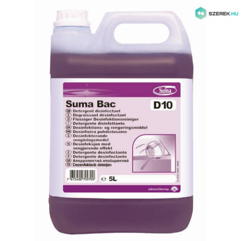 A Suma Bac D10 tisztító-, fertőtlenítő hatású (kombinált) koncentrált vegyszer, mely alkalmas valamennyi élelmiszerrel érintkező felület tisztító fertőtlenítésére. A Suma Bac D10 folyékony fertőtlenítő tisztítószer koncentrátum, amely a felületet egy l