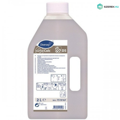 SUMA Calc D5Folyékony vízkőoldószer koncentrátum időszakoshasználatraTermékleírásA Suma Calc D5 egy savas összetételű koncentrált vízkőoldószer, mely hatékonyan használható mosogatógépek, valamint konyhai eszközök és berendezések vízkőtelenítésére. Legfon