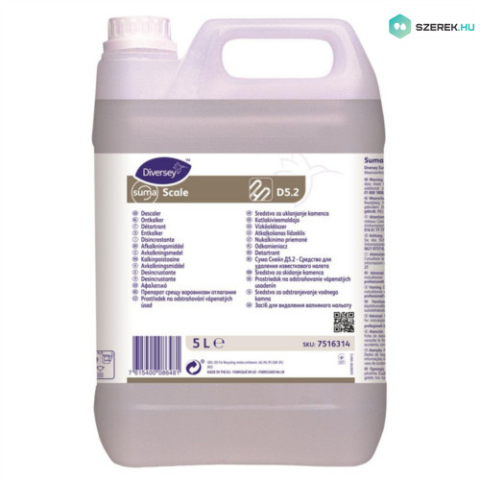 SUMAScale D5.2Konyhai vízkőoldószer időszakos használatraTermékleírásA Suma Scale D3.5 egy savas tisztítószer, mely konyhai berendezések, eszközök és mosogatógépek időszakos vízkőtelenítésére alkalmas. Legfontosabb tulajdonságokA Suma Scale D3.5 hatékonya