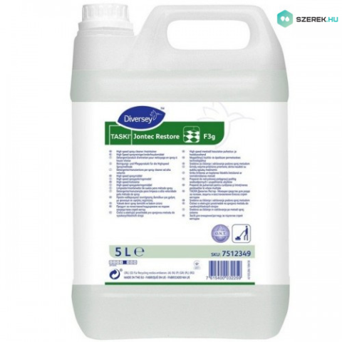 TASKI Jontec RestoreMagasfényű spray tisztító/ ápoló szerLeírás: Magasfényű napi porlasztófejes tisztító-és ápolószer, bevonatolt vagy bevonat F3g nélküli padlóra. (Használható alacsony és magas fordulatszámú egytárcsás gépekhez.)Háromszoros hatás: • Eltá