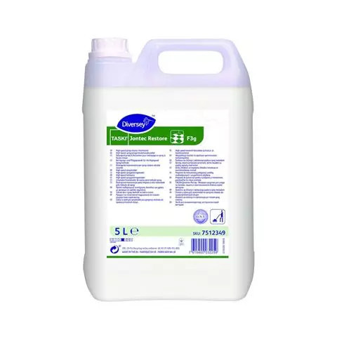 TASKI Jontec RestoreMagasfényű spray tisztító/ ápoló szerLeírás: Magasfényű napi porlasztófejes tisztító-és ápolószer, bevonatolt vagy bevonat F3g nélküli padlóra. (Használható alacsony és magas fordulatszámú egytárcsás gépekhez.)Háromszoros hatás: • Eltá