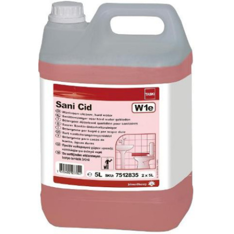 TASKI Sani CidFürdőszoba tisztítószer kemény vízhezTermékleírásCitromsav alapú tisztitószer, saválló felületekre, kemény vízű területeken. Legfontosabb tulajdonságok• Enyhén savas és gátolja a vízkőképződést• Gyengéd összetétel a használat maximális bizto