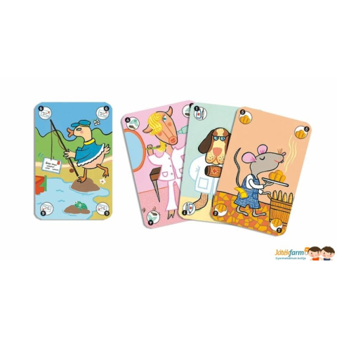 A játék tartalma: 42 (7x6 kártyalap) a 7 család: A/ Pék család, B/ Zöldséges család, C/ Tűzoltó család, D/ Halkereskedő család, E/ Fodrász család, F/ Postás család, G/ Orvos család Minden család 6 tagú: Nagypapa (1), Nagymama (2), Apuka (3), Anyuka (4), F