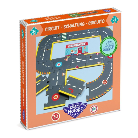 Egy óriási Crazy Motors versenypálya izgalmas kalandokhoz. A 26 puzzle darabból álló készlet végtelen pályaépítési lehetőséget kínál. A gyerekek elképzelhetik, megtervezhetik és megépíthetik a utat, a versenypályát. Készen állsz az indulásra? A játék órák