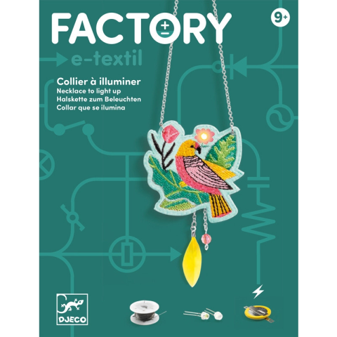 Nyaklánc - Elektronika és LED izzók a hímzett medálon. Készítsd el! DJECO - Factory - Nyaklánc hímzett medállal LED izzóval és fém hímzőszállal elkészítve. Készítsd el a különleges nyakláncodat, csatlakoztasd a gombelemhez és a ledizzó felvillan, amik