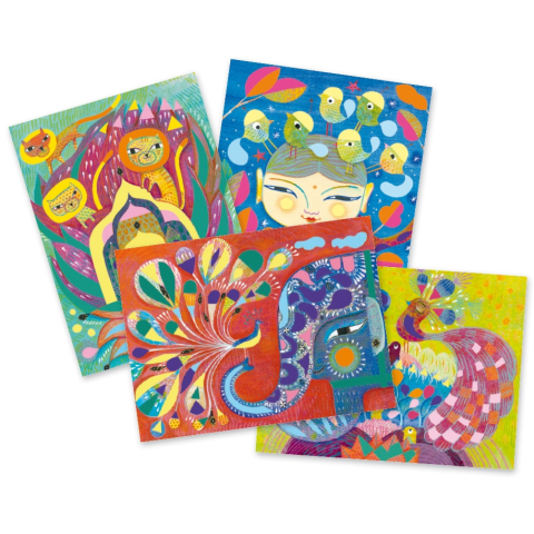 Gouache festék és színezhető előrenyomtatott képek a Djeco-tól. Indiai hangulatú kifestők. Muriel Kerba grafikus művész gyermekeknek illusztrál meséket, könyveket. Ez a munkája is a gyermekekhez közelálló motívumokat tartalmaz. Kedves és bájos képek mu