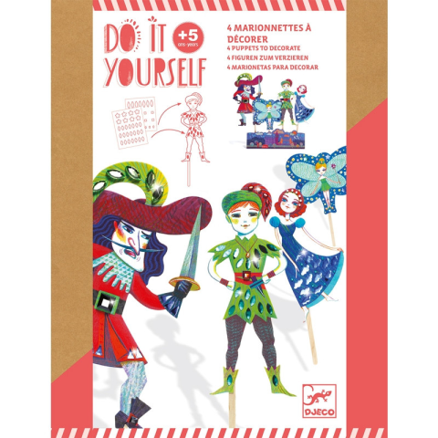 Pálcásbábok díszítése, készlet a Djeco-tól. 4 Pán Péter mese szereplő bábokat tartalmazó kreatív készlet. A gyermek a híres mese szereplőit (Pán Péter, Hook kapitány, Wendy és Csingiling) öltözteti fel a matricák megfelelő helyekre történő felragasztás
