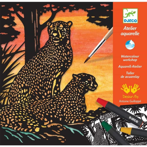 Kreatív képkészítés színezéssel, állatok a dzsungelben, a Djeco-tól. Háttérfestés, vízben oldódó pasztellkrétával. A Djeco trükkös képkészítő készletével többféle színezésű kép készíthető. A háttér megfestése a különleges vízben oldódó pasztellkrétákka