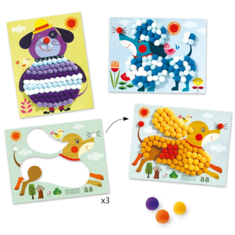 Ki ne szeretne bolyhos kutyusokat simogatni? Ezzel a kreatív szettel most te készítheted el őket! Ragaszd fel a puha pompomkat a kijelölt helyekre, és alakítsd át a kutyusokat igazi cuki szőrgombócokká. Kreativitás francia stílusban! A Djeco egy francia