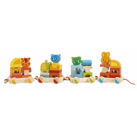 Több darabból álló, minőségi fából készült húzható és építhető játék.