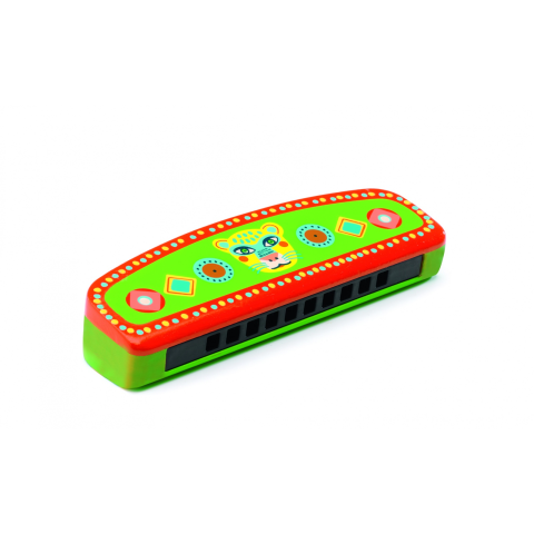 Tigris mintás gyermek szájharmonika a Djeco Animambo játékhangszer sorozatban. Tigris mintás gyermek szájharmonika a Djeco Animambo játékhangszer sorozatából. A szájharmonika (más néven: „herfli”) levegővel működő, azaz aerofon hangszer, mely megszólal