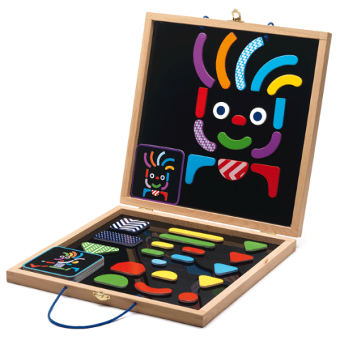 A doboz tartalma: 35 db geometriai puzzle rész, 20 db kreatív kártya, mágneses fadoboz
