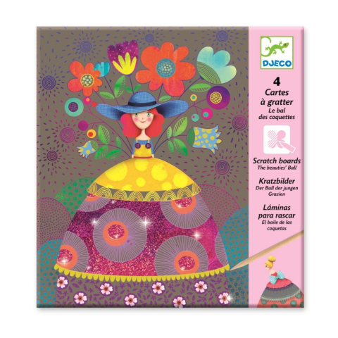 Djeco The beauties' ball - Képkarcoló, A szépségek bálja! 4 különleges képet tartalmazó készlet. A szürke felület alatt egy varázslatos világ vár felfedezésre, melynek előtűnéséhez a mellékelt fa eszközzel kell a már előre megrajzolt vonalakon belül az út