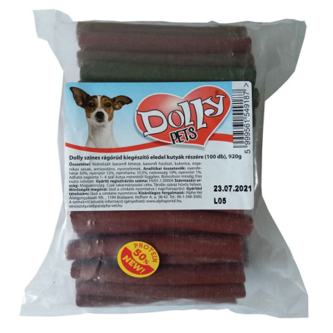 Kiegészítő eledel kutyák részére. Összetétel: hidrolizált baromfi fehérje, baromfi húsliszt, kukorica, organikus savak, antioxidáns, nyomelemek. Analitikai alkotórészek: nyersfehérje 50,0%, nyerszsír 12,0%, nyershamu 10,5%, nedvesség 10,0%, nyersrost 1,0%. Adagolás: Jutalomként adható naponta 1-2 szál, a kutya méretétől függően! Gondoskodjon mindig friss, tiszta ivóvízről! Kedvtelésből tartott állatok etetésére szolgáló termék!