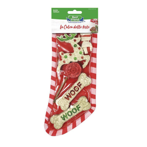 Karácsonyi zokni. Nagy méretű, ízletes marhabőrből készült jutalomfalatokkal kutyáknak. A csemegék színei és stílusa jellemzően karácsonyi. A zokni tartalma: kétszínű csomózott csont, nyalóka, 2 db rágcsáló csont, 1 db ugrószarvas.