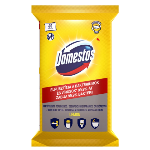 DOMESTOS fertőtlenítő törlőkendő Lemon 60 db tisztító- és takarítószer, higiénia termékleírás