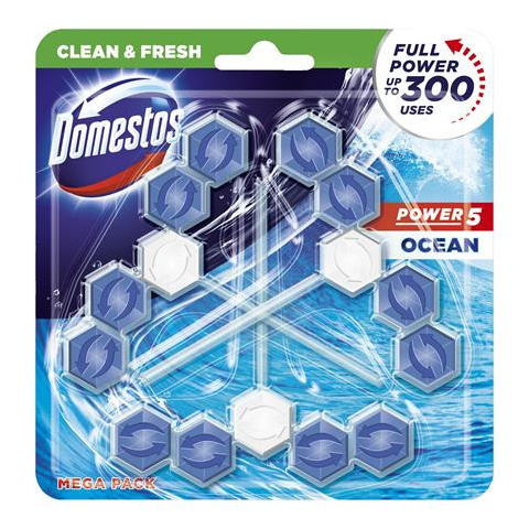 DOMESTOS WC frissítő blokk, 3 db-os, DOMESTOS "Power 5", óceán tisztító- és takarítószer, higiénia termékleírás
