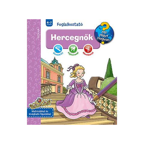 A Ravensburger Mit? Miért? Hogyan? Foglalkoztató sorozatának e kötete a hercegnők életével ismerteti meg az apróságokat. Kiből lesz hercegnő, hogyan öltözködtek a hercegnők, kivel laktak, és mi mindent kellett megtanulniuk? A foglalkoztató játékos feladatait megoldva a gyerekek e kérdésekre is megkapják a választ. A kifestőkből, különféle rajzos rejtvényekből, valamint "csináld magad" játékokból és kísérletekből összeállított foglalkoztatókat tömören
