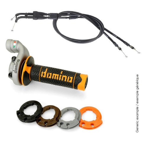 A KRK EVO készletben összevontuk a Domino Throttle-t és kábeleket egy hasznos készletben.A KRK EVO készlet tartalmazza:- Kábelek- Markolatok- 4 különböző görgőt, amelyek segítségével változtathatja a sebességet és beállíthatja a gázkar vezérlését saját motorozási stílusához és pályakörülményeihez.Szürke görgő: Gyorsaság => 3,0 °/mm; Max löket: 38 mmBarna görgő: Gyorsaság => 2,8 °/mm; Max löket: 39 mmNarancssárga görgő: Gyorsaság => 2,7 °/mm; Max