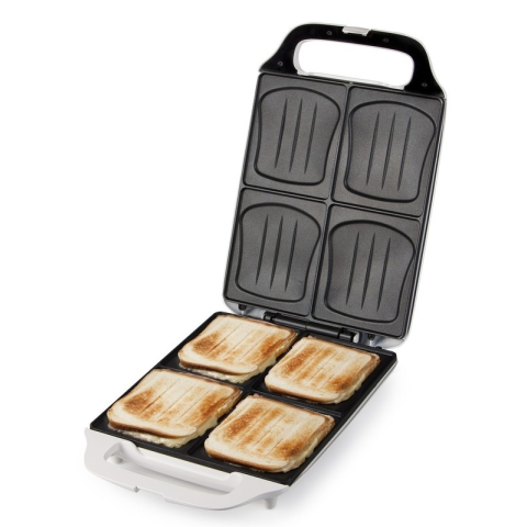 Domo DO9064C családi melegszendvics sütő XXL kenyérhez Családi melegszendvics sütő XXL nagy méretű kenyérhez 4 db melegszendvics készítése egyszerre Nagy méretű sütőfelület (270 x 320 mm) XXL melegszendvics mérethez 50&percnt-al nagyobb sütőfelület (a