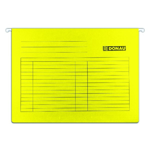 Függőmappa DONAU A/4 karton sárga 25 darabos Függőmappák dokumentumok nyilvántartásához és tárolásához. A belsejében lévő tömör fémrúd meghosszabbítja a termék élettartamát. Az előnyomtatott táblázatnak köszönhetően a teljes felülete feliratozható. A