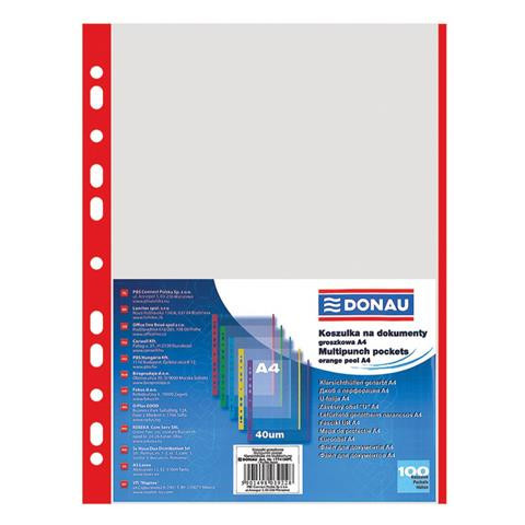 Genotherm, lefűzhető, színes szélű, A4, 40 mikron, narancsos felület, DONAU, piros - A4 méretű dokumentumok hosszú távú, lyukasztás nélküli tárolására - felül nyitott - narancsos felület - 11 lefűzőlyuk - színes oldalcsíkkal, mely megkönnyíti az iratok