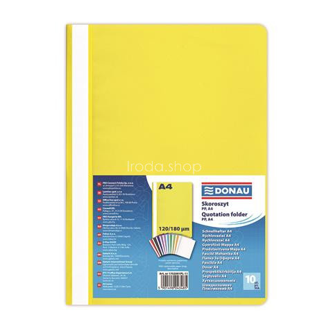 Gyorsfűző, PP, A4, DONAU, citromsárga - A4 méretű dokumentumok tárolására - 200 lap lefűzésére alkalmas - 110 µ polipropilén áttetsző, narancsos fedlap és 180 µ polipropilén hátlap - feliratozható oldalcsík - 12 színváltozat Gyártó/első EU forgalmaz