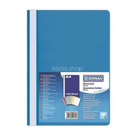 Gyorsfűző, PP, A4, DONAU, kék - A4 méretű dokumentumok tárolására - 200 lap lefűzésére alkalmas - 110 µ polipropilén áttetsző, narancsos fedlap és 180 µ polipropilén hátlap - feliratozható oldalcsík - 12 színváltozat Gyártó/első EU forgalmazó elérhe