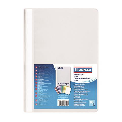 Gyorsfűző, PP, A4, DONAU, szürke - A4 méretű dokumentumok tárolására - 200 lap lefűzésére alkalmas - 110 µ polipropilén áttetsző, narancsos fedlap és 180 µ polipropilén hátlap - feliratozható oldalcsík - 12 színváltozat Gyártó/első EU forgalmazó elé