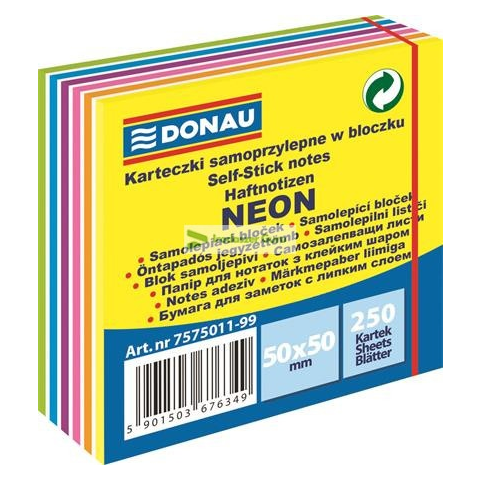 Öntapadó jegyzettömb, 50x50mm,250 lap, DONAU, fehér és neon színek Jegyezze fel! -üzenethagyásra ideális az irodában és otthon -5-féle neon színből, fehér elválasztólapokkal -kiváló tapadás, áthelyezhető jegyzetlapok -méret: 50x50 mm -250 lap/csomag