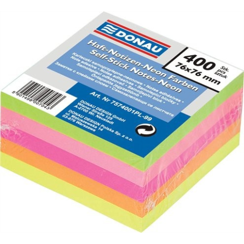 DONAU Öntapadó jegyzettömb, 76x76mm, 5x80 (400) lap, Donau, neon szín