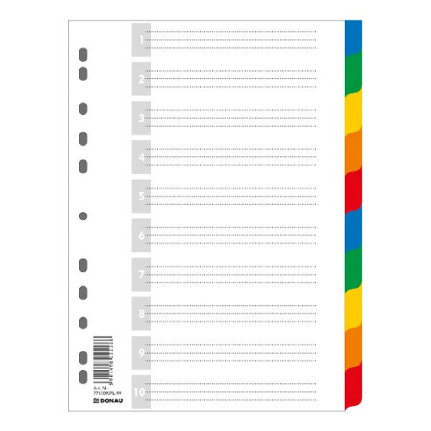 Regiszter DONAU A/4 műanyag 10 részes színes 11 lefűzőlyukkal ellátott regiszter 10 színben a dokumentumok áttekinthetőségéhez iratrendezőkben, gyűrűskönyvekben. A csomag +1 db előre nyomtatott, fehér, karton első lapot tartalmaz.