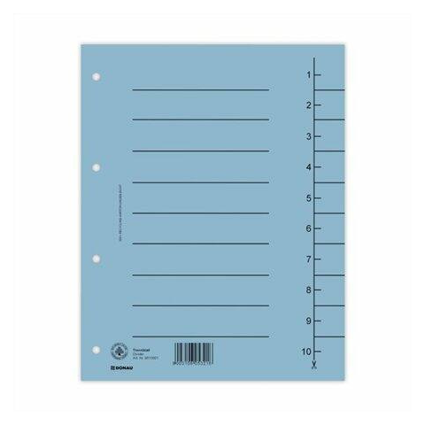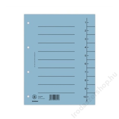 Regiszter, karton, A4, DONAU, kék (D8610K) - lefűzött dokumentumok kategorizálására - színes elválasztólapok - újrahasznosított, 250 g/m2 kartonból készült - 100 db/csomag - 4 lefűzőlyuk - méret: 235x300 mm Gyártó/első EU forgalmazó elérhetősége: PBS