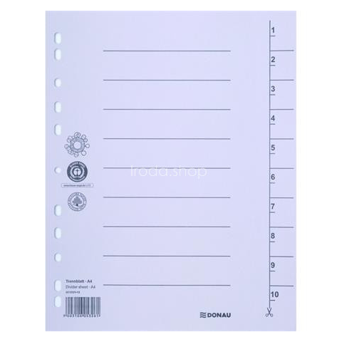 Regiszter, karton, A4, DONAU, szürke - lefűzött dokumentumok kategorizálására - színes elválasztólapok - újrahasznosított, 250 g/m2 kartonból készült - 100 db/csomag - 4 lefűzőlyuk - méret: 235x300 mm Gyártó/első EU forgalmazó elérhetősége: PBS Connec