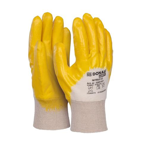 Pamut kötött anyagból készült kesztyű, 3-ben sárga nitril bevonattal. -mechanikai, szolgáltatási, szállítási, építési, ipari és mezőgazdasági munkákhoz tervezve -sárga nitril bevonat, nagy kopásállósággal -nedves és olajos környezetben végzett munkákhoz tervezve (víz- és olajálló kesztyű) -puha szegéllyel -mechanikai sérülésektől védő védőkesztyű -kategória: II. -megfelel az EN 388:2016+A1:2018 (4111X) és EN ISO 21420:2020 szabványoknak -anyagok: pa