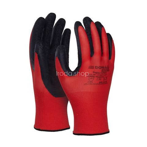 Jó minőségű, piros színű, kötött poliészter szövetből készült kesztyű, a markolat részén fekete színű, érdesített latex bevonattal. -összeszerelési, raktározási, gépészeti, szervizelési, szállítási, építési, javítási, ipari, mezőgazdasági, kertészeti é